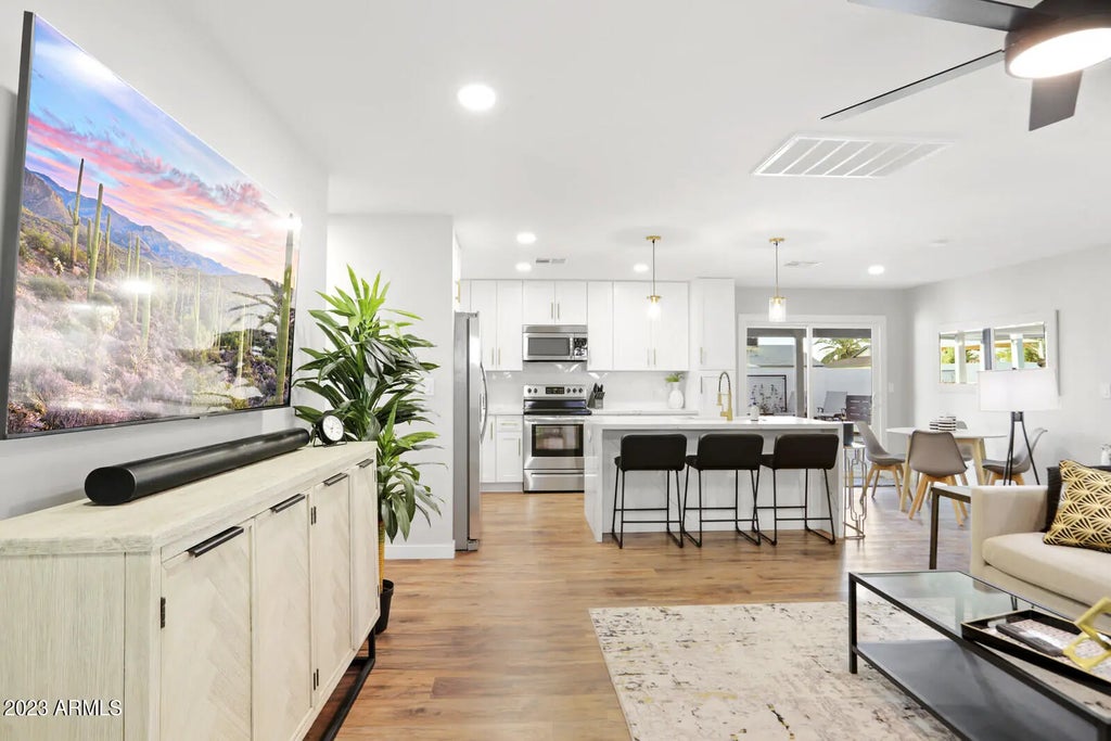 Fully remodeled house and resort style, heated pool. Just 10 minutes from old town Scottsdale/Tempe, and in the center of it all! Private backyard includes: heated -saltwater- waterfall pool, cabana, dinning table, Sonos outdoor sound system, tv, gas fire pit, BBQ grill, putting green and a full outdoor bathroom with 2 showers. Fully furnished house features: 2 separate master suites w/attached full bathrooms, walk in closets and wall mounted TV's, a third bedroom, and 4 total bathrooms. Other amenities: Gourmet kitchen, completely stocked w/ everything down to small appliances & cookware. Master 1 w/ sitting area and desk. Located near Scottsdale Road & McDowell, 10 minutes Fashion Square Mall, Phoenix Sky Harbor Airport & desert hiking trails. Vacation rental license #2035374