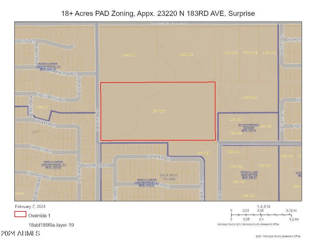 PRIME PAD Zoned 18+ acres ready for commercial or residential development! The North Copper Canyon subdivision borders this acreage on 183rd Ave on the west and also on the south side where Patrick Ln meets 181st Ave. According to the owners, public sewers and water and electricity are on 183rd Ave and waiting for you to take advantage of one of the fastest growing areas in Surprise! Hurry on this one!! Address is Approximate.