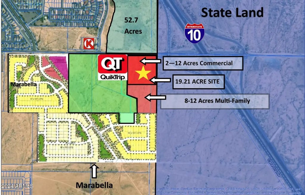 Exciting opportunity in the path of growth. This is the 1st fee simple parcel on the south side of McCartney off of the 1-10 Interchange. A total of 19.21 Acres of which 10 Acres is zoned B-2 PAD Commercial available for $2,391,490 or $8.97 psf. An excellent in demand Hotel, Gas, Restaurant or retail services site. 45' height availability, ideal for hotel. The remaining 9.2 Acres of Multi-Family zoned R-3 is available for $2,392,490 or $5.97 psf. Total of 19.2+-Acres is available for $6,299,822 or blended $7.53 psf. City allows for 20% variance between zoning. QT planning 4.66 acres adjacent to the west. Marabella approved SFR to the south. Lots of due dilligence information available to buyer. Buy all or can be split.