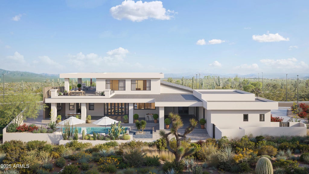 This stunning two-story contemporary ready-to-build home is truly one of a kind — showcasing bold architecture, clean lines, and high-end finishes throughout. With over 3,600 sq ft of thoughtfully designed space, this 5-bedroom, 6.5-bath home offers the perfect blend of style, comfort, and functionality. Step inside to soaring ceilings, walls of windows, and a gourmet kitchen built to impress. The expansive great room is ideal for entertaining, flowing effortlessly into the lush backyard retreat featuring a private pool, shaded patio areas, and vibrant desert landscaping. Upstairs, enjoy multiple view decks and spacious bedrooms — each with ensuite baths. The luxurious master suite offers a serene escape with a spa-like bathroom and generous walk-in closet. andscaping. Upstairs, enjoy multiple view decks, spacious ensuite bedrooms, and a luxurious primary suite that serves as a true sanctuaryoffering a spa-inspired bath, oversized walk-in closet, and serene mountain or cityscape views. Every detail of this home speaks to quality, lifestyle, and luxury. You'll also enjoy access to a beautiful community pool, creating the perfect balance of private resort living and neighborhood amenities. This home stands out for all the right reasons modern, refined, and move-in ready.