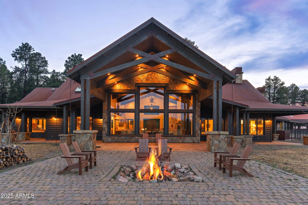 Set against the National Forest on three sides, this one of a kind mountain estate is 80 acres and captures everything you love about Northern Arizona living. The custom main home offers 4,123 sqft of living space with over 9,000 sqft under roof, blending rustic luxury with a chef's kitchen, vaulted great room, built-in custom bunk room, a porte cochère entrance, and a cozy veranda to soak in the views. A remodeled caretaker's home adds even more flexibility. Full equestrian facilities include barns, covered arena, multiple pastures, and auto waterers. Private well, pond, RV hookups, and a seasonal creek. You will be surrounded by panoramic views. Don't miss out on this legacy property.