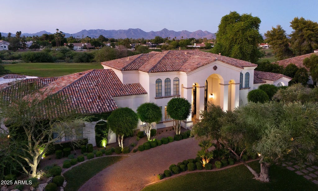 Stunning Santa Barbara on the par 5, 7th hole at Camelback CC w/ McDowell Mtn. views.... Never before on the market! Built by Kensington in 1995 and beautifully renovated in 2013 by American Traditions incl. rich finishes & fine detailing throughout. Kitchen completely updated in 2024. Elegant entry foyer showcases 20' picture window trimmed in canterra stone, overlooking the Ambiente course. Polished granite/ wood plank flooring / alder beamed ceilings create character with quality and warmth. Leaded glass accents complement the executive wood paneled study, as well as the finely crafted transom window in the gracious Primary Suite. Upstairs is a mini-master suite w/ view deck + 2 en suite bedrooms. Private home theater adjacent to Family Rm. Separate 384 sf Guest House with pool bath. Lushly mature landscaping adds tremendous privacy, defining the rear yard which surrounds the heated pool, spa, & canterra stone bancos w/ firepit, putting green, pretty raised planter, and plethora of patio spaces for entertaining family & friends.