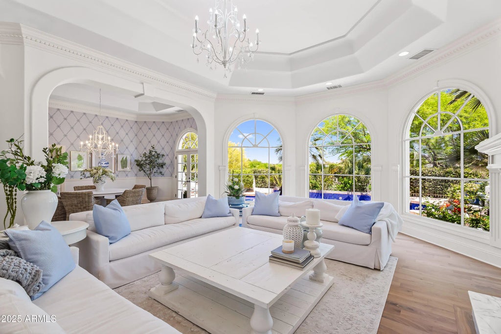 This Santa Barbara inspired 4-bedroom, 4.5-bath home sits on one of the most charming streets in Paradise Valley and offers backyard access to Camelback Golf Club. Inside, the home strikes a beautiful balance between style and comfort with thoughtful details throughout like a sweeping staircase, custom cabinetry, fresh paint and designer wallpaper. The layout flows easily through a light-filled living room, formal dining room, a spacious breakfast area, a cozy family room and office. The kitchen is complete with quartzite counters, custom cabinetry, Wolf appliances and rose garden views. The primary suite is a true retreat with a sitting area and private terrace overlooking the golf course and mountains. Each additional bedroom is spacious and ensuite offering space and privacy for all.