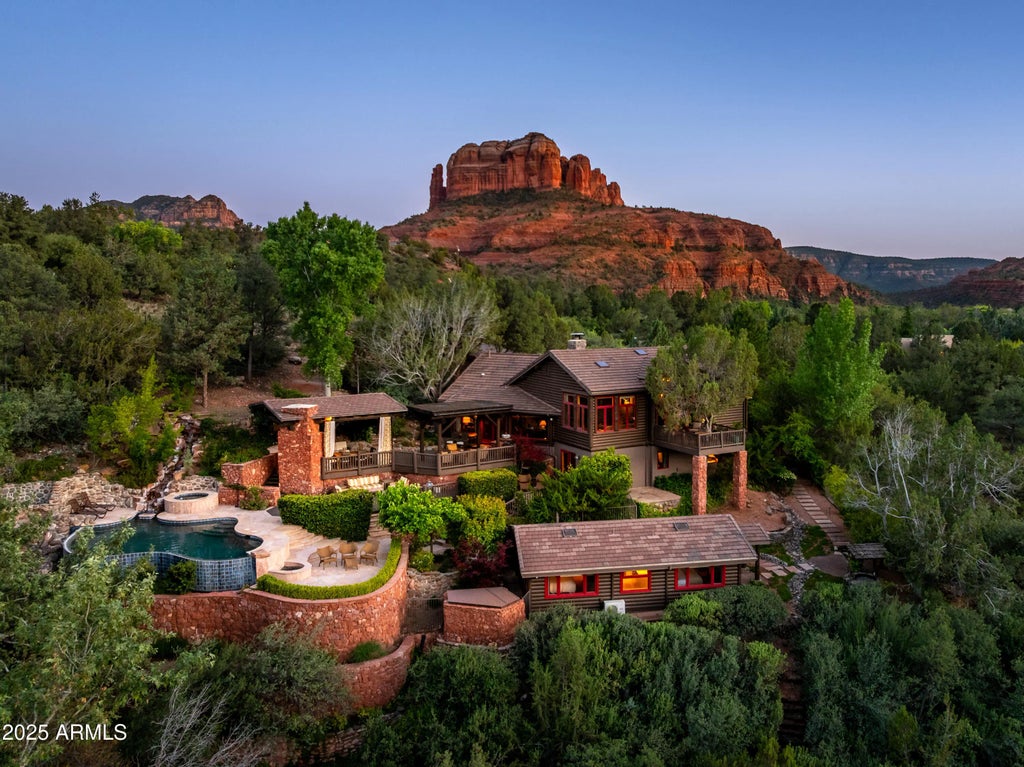 Sedona creekside luxury home with amazing cantilevered pool and spa overlooking the winding waters of Oak Creek. Located in one of Sedona's most exclusive neighborhoods, this legacy property has been owned and beloved by AZ pedigree - including AZ Governor/US Secretary Babbitt. This elevated log cabin and detached 2 bedrooms guest home is an elite waterfront escape with red rock views and has been highlighted in more design magazines and TV shows than any other in Sedona. This is a cabin like no other in Sedona - if Ralph Lauren wanted a southwest escape he'd have crafted this high quality exposed beam, wood flooring, log masterpiece - an elevated remodel without a budget. Newly remodeled backyard with negative edge pool and spa with private trail access to the shores of Oak Creek. Main house has 2 bedrooms on 2 levels, lower level primary suite, 2.5 baths, 3 fireplaces, comprising a total of 3,067sf with framed views of Cathedral Rock and 176' of creek frontage. Luxury "Old Sedona" home features Arizona pine timbers with rugged exposed trusses and beams with soaring ceilings of knotty pine T+G. Original Arizona Schist stone fireplace and surrounding reading space. Hand planed walnut flooring, custom gallery lighting; and vintage chandeliers. Massive kitchen with river rock accents opens onto an outdoor patio with direct Cathedral Rock views for ideal sunset cocktail hour. Lower level of the home is a massive primary suite complete with river rock fireplace, amazing en suite setup with separate tub and shower, walk in closets and its own washer and dryer. Detached casita is just steps away from the main house and loggia showcasing a single level 2 bedroom cabin with shared .75 bath - offering luxury and privacy for your guests. Separate Art Studio/Office/home gym abutting the 2 car garage: Heated/cooled space totaling 258sf - ideal for home gym or bike storage, yoga studio, podcast studio or home office professionals.