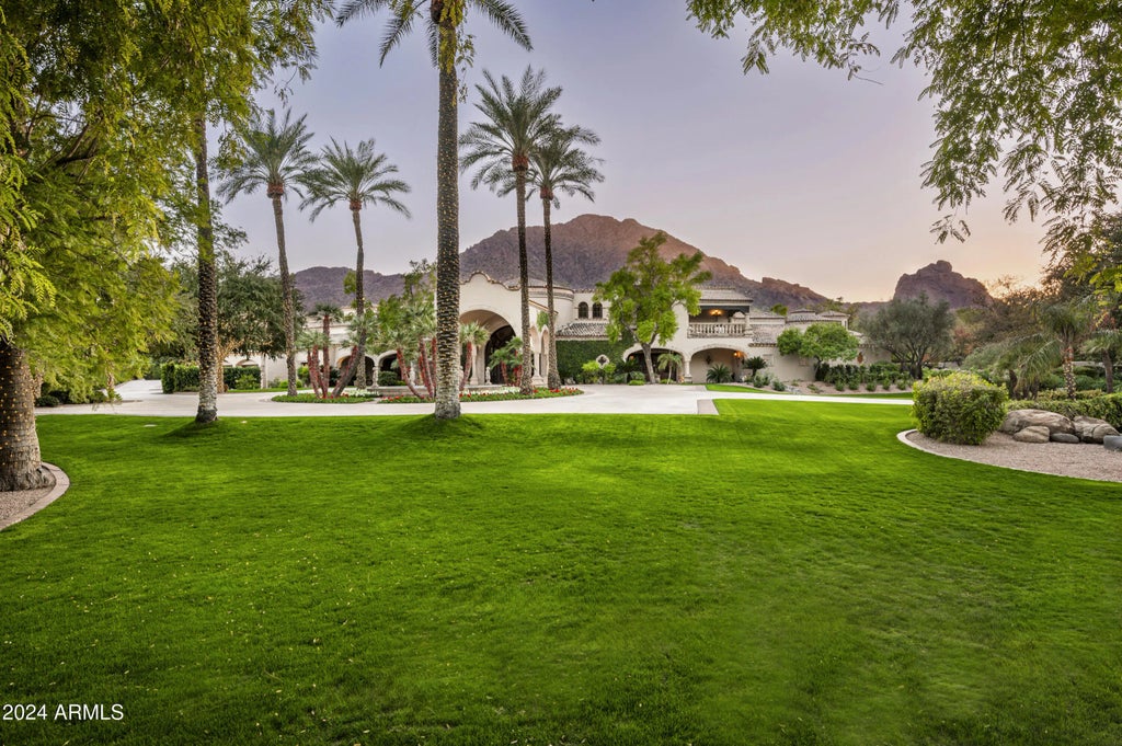 Welcome to Casa de Niños, an extraordinary 4 ACRE estate in one of the most prestigious neighborhoods in Paradise Valley. This estate offers unparalleled living experiences w/ serene ponds + waterfalls that wind thru the property. Upon entering the home, admire soaring 26ft ceilings in the great rm opening thru high arched doors to vast grounds + beautiful views of Camelback Mtn. Featuring huge lawns, tennis court, resort pool w/ swimup bar, ramada w/ charcoal + gas bbqs, 6 TVs, 2 beer taps, poolhouse w/ sauna + 16 car garages w/ man cave for 10 cars. There are 9 bedrms in this 17,250 sqft estate w/ 6 in main house, 2 apartments + guesthouse. W/ Honduras Mahogany woodwork, limestone + marble floors, elegant ceilings + fireplaces, the main home is on 1 level w/ no steps except for library. This estate is completely private with a large electronic gate at the entrance, a block wall and very tall hedges surrounding the property, as well as a long curved driveway prior to reaching the front door.