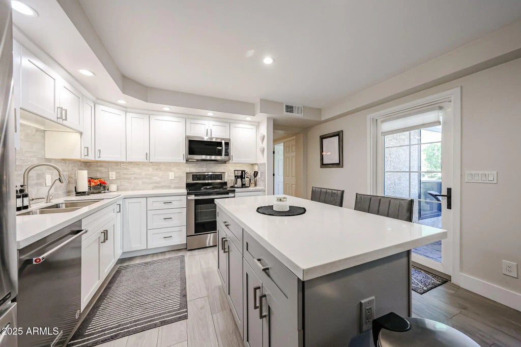 Beautifully upgraded unit in Cabrillo Square with unobstructed views of Camelback Mountain! 3BD/2.5BA, den/office/fourth BD in one of the most desirable communities in Scottsdale! This 2053 sq ft floorplan seldom comes on the market! This truly is one of kind! Totally remodeled in the interior with a contemporary feel. Dual pane windows that slide up and down with a release for easy cleaning. Newer steel, glass and fiberglass doors throughout home. Both A/C units have been replaced 2021, downstairs has a 4 variable speed Trane unit, upstairs, 2 1/2 Trane. Primary bedroom downstairs with a fourth BD, den/office, guest BD's upstairs for privacy. Kitchen is light and bright, quartz counters, SS appliances. Kitchen has access to front patio. Back patio is oversized with beautiful views of Camelback Mountain with gorgeous sunsets! Home has a water filtration system, rain gutters, two windows in the back of home have electrified sun screens. So many upgrades to mention, please see document tab with the upgrade list. This is a must show! Your clients will love this one!! Shows beautifully!!