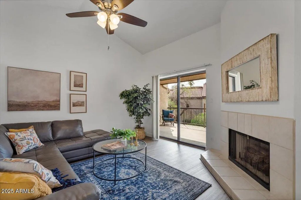Welcome to the Villages of McCormick Ranch in the heart of Scottsdale. This beautifully maintained 2-bedroom, 2-bathroom upstairs unit offers soaring vaulted ceilings that create an open and airy feel. The living room features a cozy fireplace and access to a large covered patio overlooking lush greenbelts, mature trees, and walking paths. The private balcony provides a peaceful setting to enjoy your morning coffee or evening sunsets. Inside, you'll find newer flooring, baseboards, and fresh paint throughout, making this home truly move-in ready. The functional galley kitchen is complete with ample storage and a cozy dinette area—perfect for casual meals or morning coffee. The spacious primary suite includes double sinks and ample storage, while the secondary bedroom and full bath offer flexibility for guests, a home office, or flex space. The Villages community offers resort-style amenities including a sparkling heated pool, tennis courts, and miles of walking and biking paths. Conveniently located near the Loop 101, world-class golf, hiking, shopping, and diningthis home blends comfort, convenience, and the best of Scottsdale living.