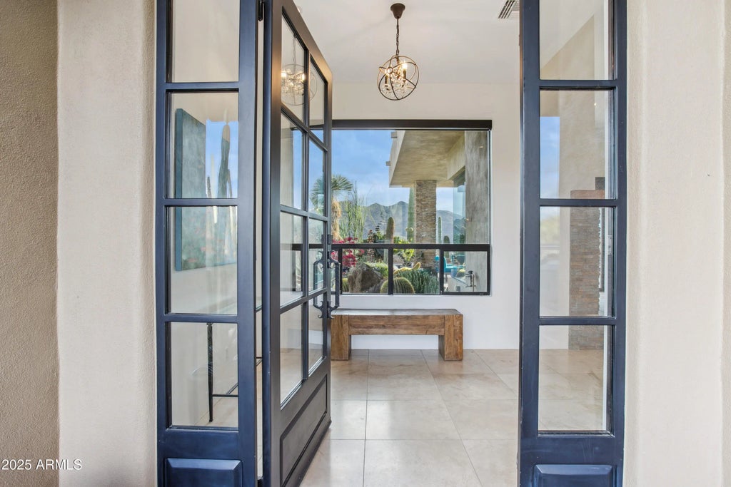 Set against the majestic backdrop of Black Mountain and the sweeping Sonoran Desert, this exceptional Carefree residence offers an unparalleled blend of refined luxury and serene sophistication. Designed as a private retreat, the home captures panoramic desert vistas from every vantage point—an ever-changing canvas of natural beauty. At the heart of the home, the great room stuns with soaring ceilings nearing 15 feet and expansive walls of glass that blur the line between indoors and out. Ideal for effortless entertaining, this open-concept space flows seamlessly into a chef's kitchen appointed with premium Thermador stainless steel appliances and sleek granite countertops—where culinary artistry meets everyday ease. The primary suite is a sanctuary unto itself, framed by breath taking desert views and enhanced by a spa-inspired en suite bath featuring a generous walk-in shower, a deep soaking tub beneath a chandelier, and a spacious, thoughtfully designed closet. Step outside to your private patio, complete with a cozy fire pit, and revel in the quietude of the high desert. Two additional bedrooms with a shared, updated bath are nestled in their own wingperfect for guests or familywhile an expansive guest suite above the garage offers its own patio and sweeping views, creating an inviting haven for visitors. A sparkling pool and deep spa lie just beyond the great room, offering a tranquil escape amid beautifully designed outdoor living spaces, ideal for dining or entertaining under the stars. The retractable glass wall opens wide, creating a seamless connection to the natural world and embodying the essence of Arizona indoor-outdoor living. Every detail of this extraordinary home has been curated with grace and intention. This is Carefree living at its finestwhere elegance meets ease, and nature takes center stage.
